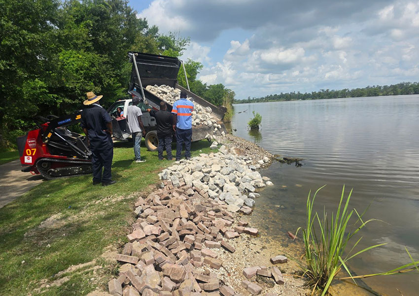 The #retreeLC campaign addressed this need, mobilizing community volunteers and industry partners to replant urban forests. Through this effort, volunteers replanted 20 acres at Tuten Park, while strategic shoreline plantings at Riverside Park combat erosion from flooding and recreational watercraft. Utilizing both traditional infrastructure planning and nature-based solutions, Lake Charles is installing bulkheads combined with natural erosion control along its lakefront walking path and Calcasieu River shoreline. A $1.5 million project will create comprehensive shoreline protection along Riverside Park's three-quarter-mile walking track. This project combines outdoor recreation with sound, nature-based solution practices that meet community needs.