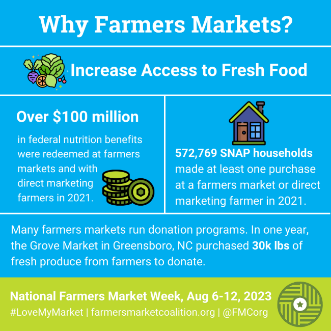National Farmers Market Week (NFMW) is approaching! The 24th annual celebration takes place August 6 to 12, 2023, and highlights the vital role farmers markets play in the nation’s food system.