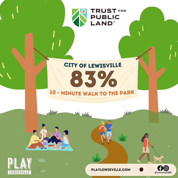 Lewisville has made substantial progress toward its 10-Minute Walk goal. According to TPL, 83 percent of residents now live within a 10-minute walk to a park, up from 77 percent in June 2023 and 60.4 percent in 2019. This progress brings the city remarkably close to its target of ensuring 85% of residents have park access by 2025.