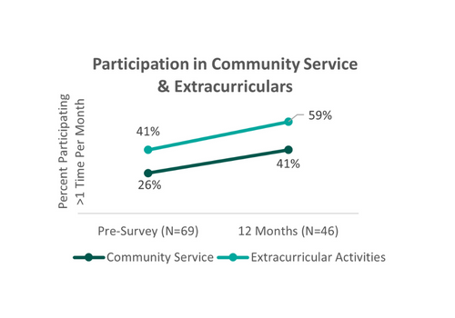 The rate of mentees who engaged in community service increased 15 percentage points to 41 percent after 12 months in the program. Involvement in extracurricular activities increased at a similar pace, with 59 percent reporting involvement at the end of their participation.