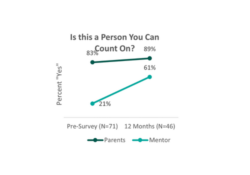 The rate of mentees who reported they could count on their parents increased from the beginning of their involvement (pre = 83 percent) to after 12 months in the program (89 percent). As the program progressed, mentees also were more likely to say they could count on their mentors, with rates increasing 40 percentage points to 61 percent after 12 months in the program. When interviewed, a number of youth mentees shared their mentor had an open ear and they could talk to them about anything.