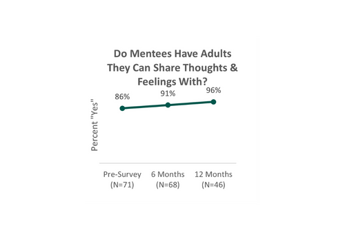 Mentees were increasingly more open to sharing their thoughts and problems with adults. The rate of mentees reporting they have adults to share thoughts and feelings with increased 10 percentage points to 96 percent after 12 months in the program.
