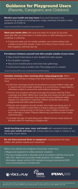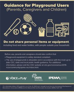 NRPA continues to work alongside partners including CDC, IPEMA and Voice of Play, and KABOOM! to provide up-to-date resources on safe playground operations. We encourage your agency to continue to consult with local public health and government officials and have a plan for scaling up additional mitigation strategies quickly should they be needed.