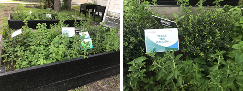 Pictured: The photo on the left is of a raised bed in a garden with a variety of green leafy herbs and white and green paper identifiers. The photo on the right shows a blue, green and white laminated identifier that says, “Texas Tea Garden” on a background of two different leafy green herbs. Photo Credit: The City of Pflugerville.