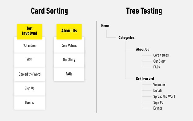 Community volunteers can provide helpful input on your website’s navigation, so put them to work by conducting several types of tests, including card sorting and tree testing, shown below. Card sorting asks volunteers to logically organize subtopics as they could be categorized on your website, while in tree testing, they’ll click through a prototype version of your site menu to find specific information.