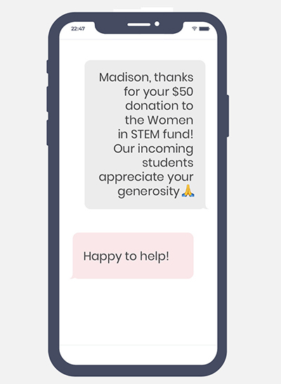 For instance, sending quick, personal thank-you texts to follow up with someone after an event or show volunteers your appreciation helps community members feel appreciated and invites them to respond in easy ways. Take a look at this example of how a donor turned a basic thank-you message into an opportunity for a personal conversation: