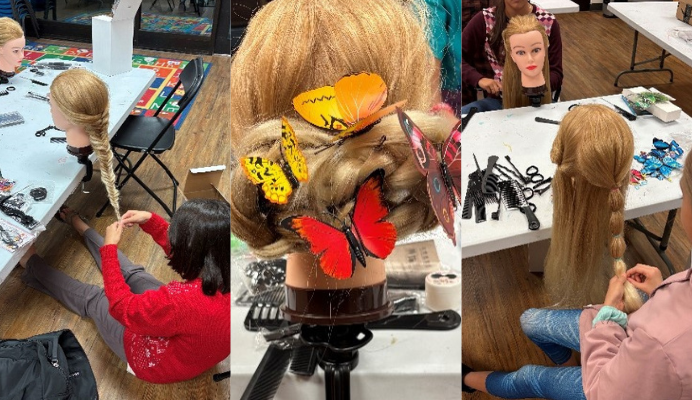 Young Stylist is a month-long class for youth ages 8-18, where participants can explore fun, interactive hair styling to learn essential techniques, achieve amazing looks and express their creative side. Kids learned how to do simple braids, fishtail braids, wedding hairdos (styling, braids, curling), and how to do hair tinseling. This class teaches patience, hand-eye coordination and creativity. And, it gives the girls freedom to do their own hair or anyone else’s hair around them.