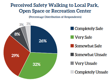 While these numbers are encouraging to NRPA’s vision that “everyone will have easy access to park and recreation opportunities in sustainability communities,” the Americans’ Engagement with Parks survey also addresses Americans perceived safety walking to the local park, open space, or recreation center. A major determinant for the number of visits a person makes to their local park and recreation facilities is whether they can safely travel to and from these areas. Nearly three in five Americans feel “completely” or “very” safe walking to and from their local park and recreation facility (58 percent) while another 29 percent characterize the walk as being “somewhat safe.”