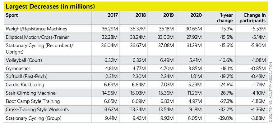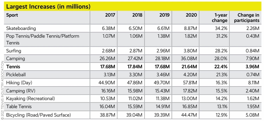 At the recreation level, activity throughout the past year suggests that people have taken to the sport during the pandemic, and the numbers confirm it. Annual data shows significant growth in racquet sales and tennis participation across the United States. Tennis participation in the country increased by 22 percent in 2020, with 21.64 million people hitting the courts, according to data from the Physical Activity Council’s (PAC) Participation Report produced by Sports Marketing Surveys. The survey and report monitor more than 120 different sports and activities participated in by U.S. residents (see charts below).