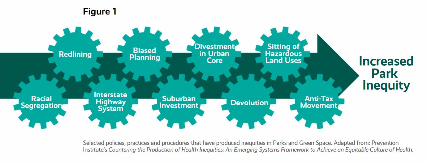 Green spaces should serve every community in a fair, just, safe and healthy manner. For more than a century, park and green space inequities have unfairly affected low-income communities throughout the United States, especially people living in predominantly Black and Latino neighborhoods. These inequities reflect historical and current-day policies and practices. As shown in Figure 1, the historical factors contributing to park inequities include racial segregation, biased planning decisions, exclusionary zoning and redlining, among others. Present-day drivers of park inequities include tax and fiscal restructuring, shifting responsibility for public services, and reduced ability of cities with limited tax bases and large low-income populations to provide park and recreation services.