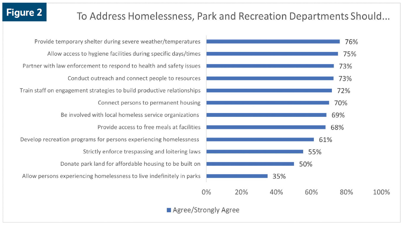 Among other things, their survey asked three timely questions to better understand public perception related to homelessness in parks: (1) What is the duty of park and recreation departments to help address homelessness? (2) Are park and recreation departments equipped to address homelessness? and (3) What specific actions should park and recreation departments pursue to help?