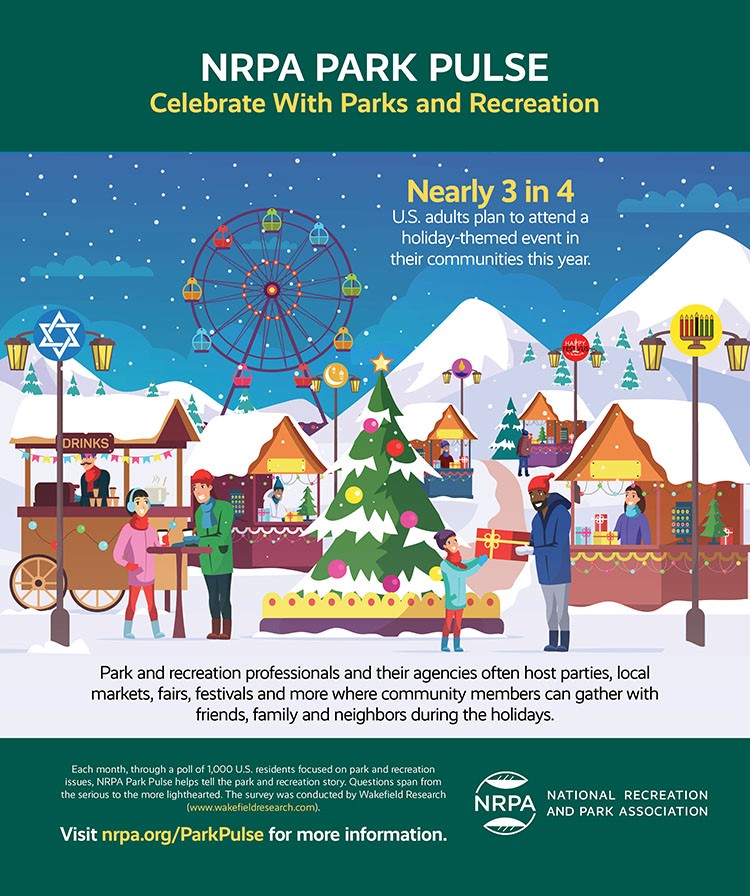 Year-round, local park and recreation professionals aim to provide opportunities for family fun and community engagement and the holidays are no exception. Nearly three in four U.S. adults or a family member plan to attend a holiday-themed event in their community this year. Parents are especially looking forward to these events with 90 percent likely to attend one or more holiday activities in their community.