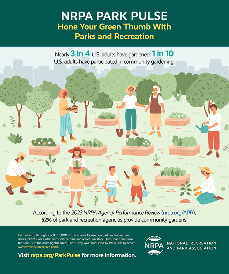 Whether growing vegetables or flowers, many park and recreation agencies provide community gardens for all to enjoy. Nearly three-quarters of U.S. adults have gardened in their lifetime. Having access to community gardens provides people without the space or means to grow plants where they live that opportunity. Ten percent of the population participates in community gardening.