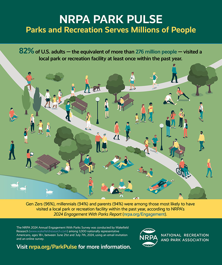 Eighty-two percent of U.S. adults — the equivalent of more than 276 million people — visited a local park or recreation facility at least once within the past year. Nearly every U.S. adult (96 percent) has been to a local park or recreation facility in their lifetime. Local parks and recreation are an essential part of individuals and families alike — offering physical and mental wellness opportunities, spaces for spending time with family, friends or people within the community, and so much more. It is no wonder so many have made a visit to their local park or recreation facility a part of their lives in the United States.