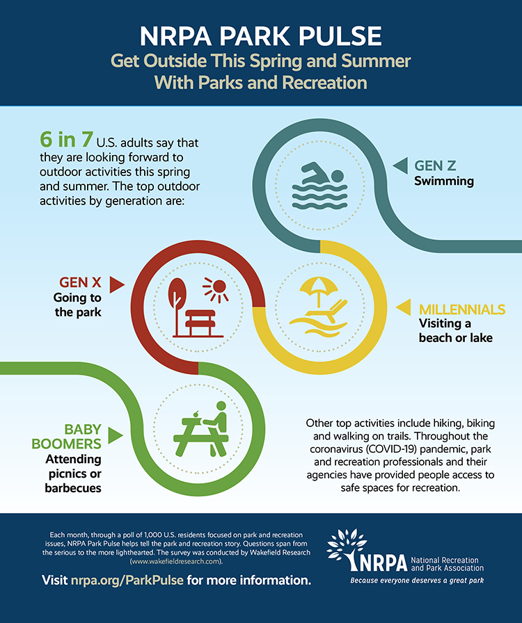 Six in seven adults in the United States look forward to outdoor activities this spring and summer. The most sought after activities include going to the beach or lake, going to the park, attending a picnic or BBQ, swimming and being active on the trails. Park and recreation professionals ensure the public can enjoy their favorite outdoor activities and be safe at the same time.