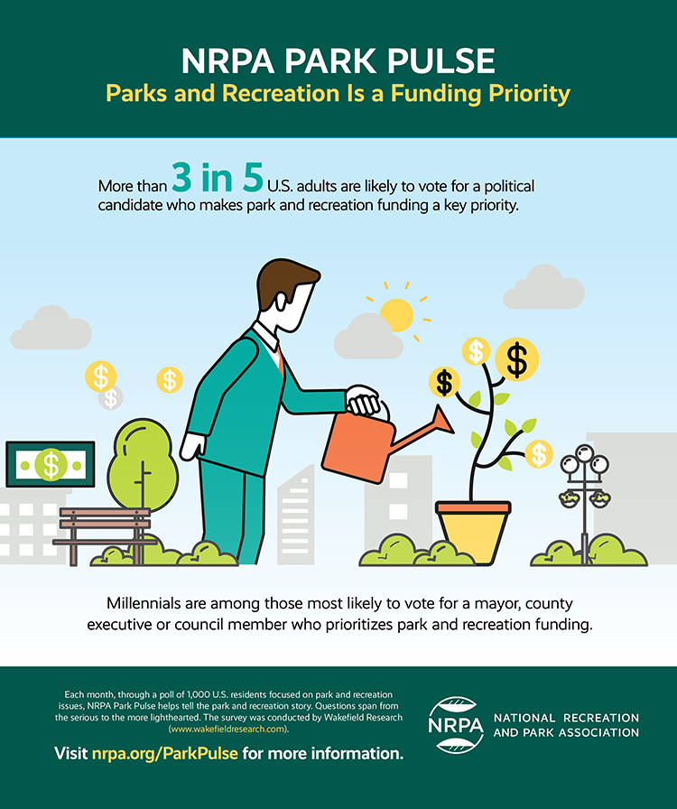 - Compared to adults overall, millennials (69%) are more likely to vote for a political candidate that makes park and recreation funding a priority.