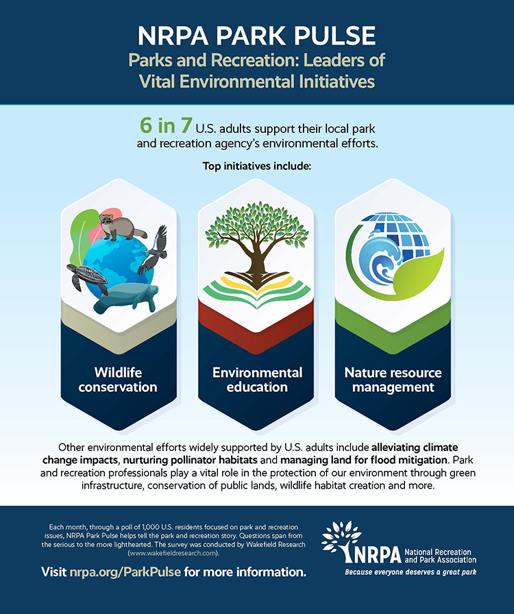 Six in seven adults in the United States support their local park and recreation agency’s environmental initiatives. These park and recreation professionals manage a wide-range of environmental efforts within their community, such as wildlife conservation, educating the public on environmental issues, natural resource management, mitigating the impacts from climate change, nurturing pollinator habitats and managing land for flood mitigation.