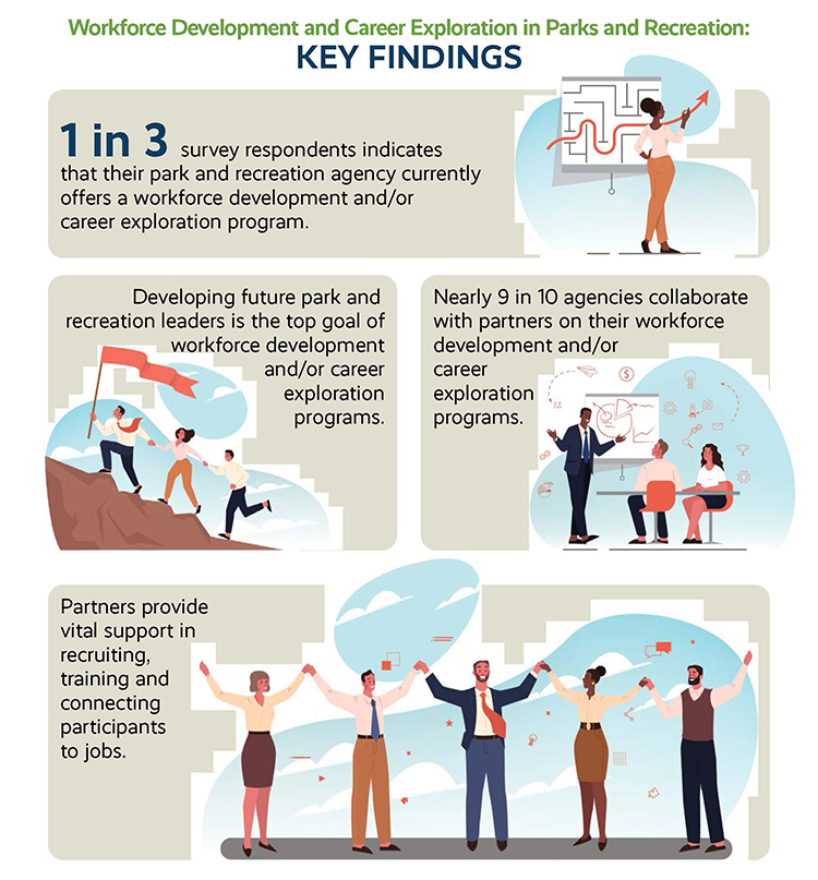 - One in three park and recreation departments currently offer a workforce development or career exploration program targeted to teenagers, young adults and other people entering the labor force for the first time
